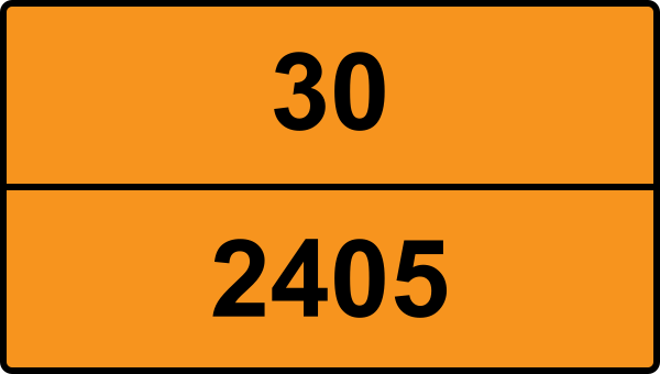 UN 2405 kräver faroetiketter för ADR klass 3. Etiketten ska vara minst 100×100 mm och placeras synligt på kollit. Se detaljerad information ovan för exakta etiketter.